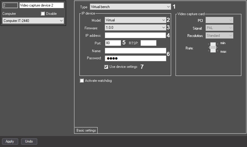When you create the Video capture device, you must set the following parameters for each IP device:
