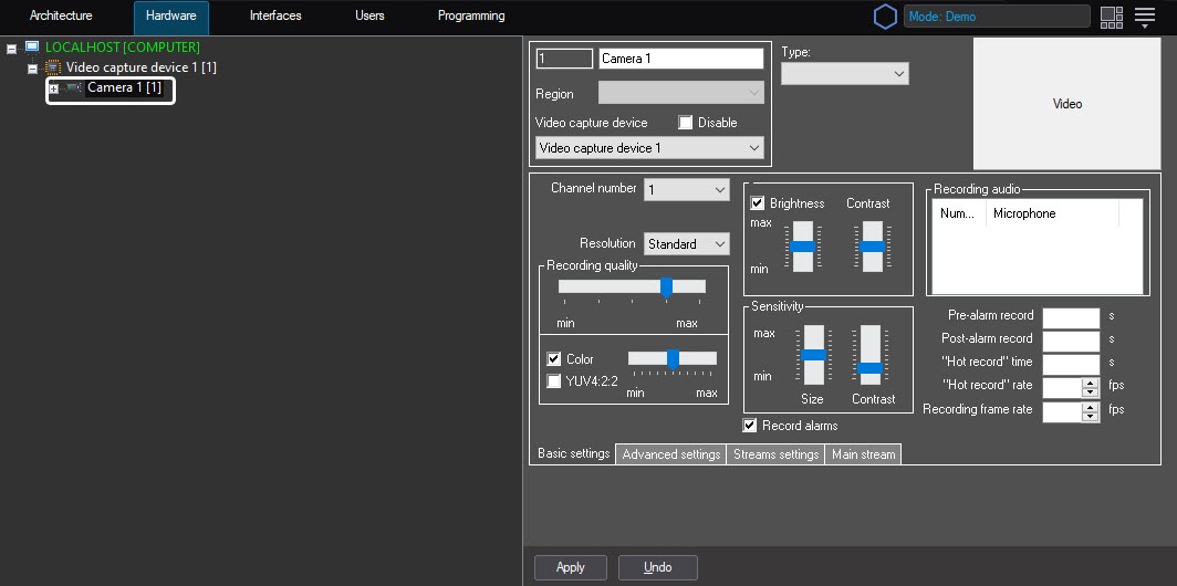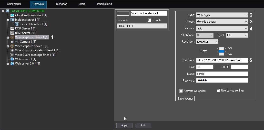 - Create the Video capture device on the basis of the Computer object on the Hardware tab of the System settings dialog window (1).