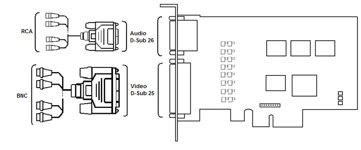 FX416 video capture card has two external pins - D-SUB 25 and D-SUB 26. Simultaneous connection of up to 16 cameras and 16 sound sources to external pins of FX416 video capture card is possible. Video connection is performed with the help of D-SUB 25/BNC stub and audio connection is performed with the help of D-SUB 26/RCA stub.