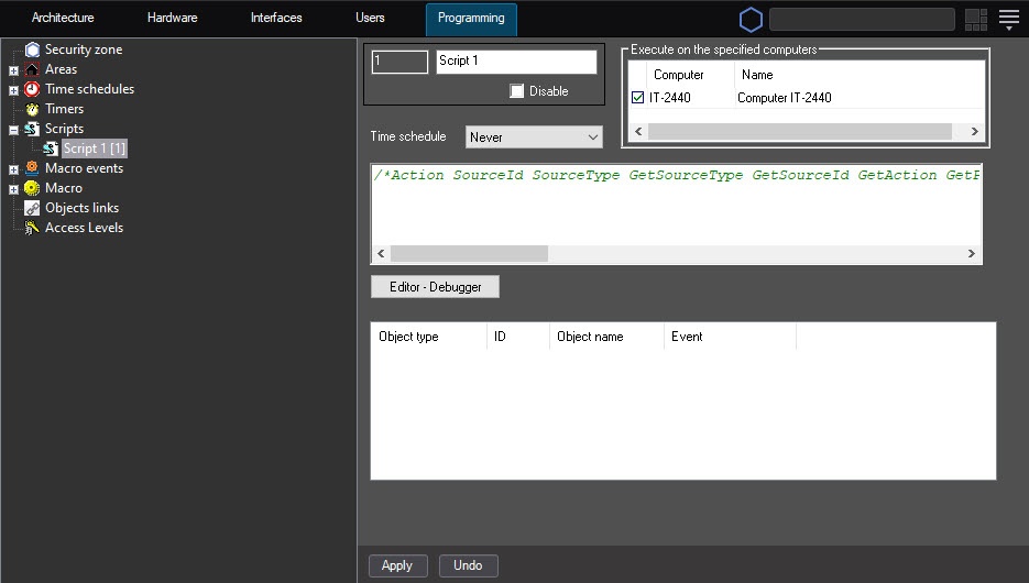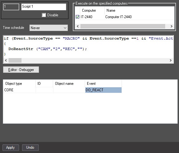 Besides, you can configure the events filter—the list of events that the Script system object processes. Entering an event to the filter is equal to the if operator in the script text, that is, when you specify the event is in the table, you can omit this operator.