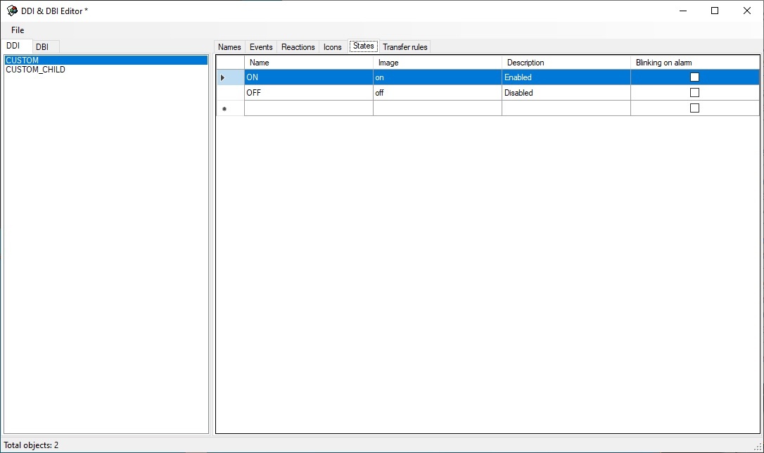 Go to the States tab and describe the states that the object can take. Here there are two states—ON and OFF.