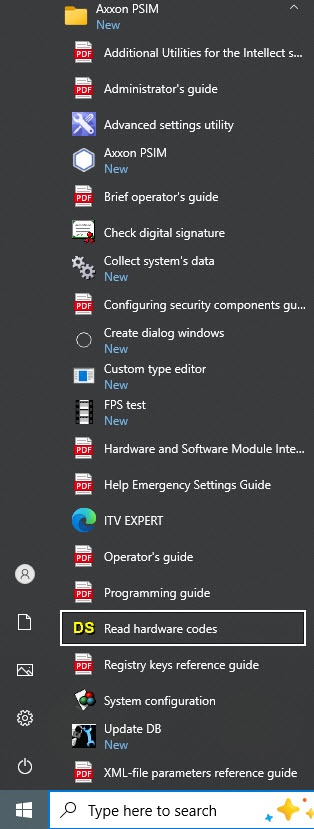 1. Start the utility from the Windows taskbar. To do this, click Start -> All Programs -> Axxon PSIM -> Read hardware codes. The CodeReader.exe utility is available from the Start menu with the following Axxon PSIM installation types: Server, Remote administrator workstation.