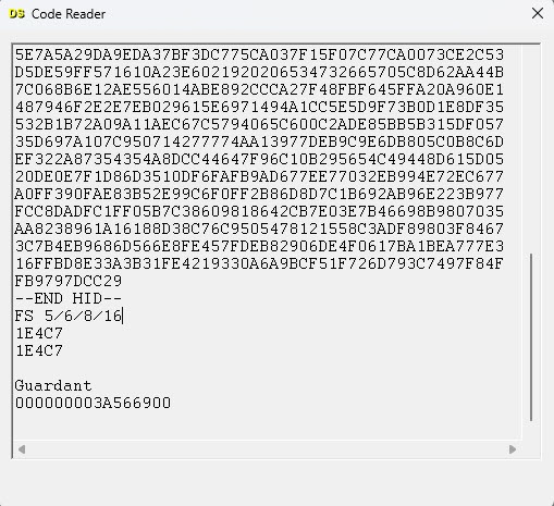 The CodeReader.exe utility allows determining the type of the video capture card installed on the computer by its dallas code(s), as well as the number of the Guardant or MatrixLock dongle. To read this information, start the utility (see the Starting and shutting down the CodeReader.exe utility section). The type of the video capture card, its dallas code(s), the number of the Guardant/MatrixLock dongle, and the HID are displayed in the field of the CodeReader.exe utility dialog window.