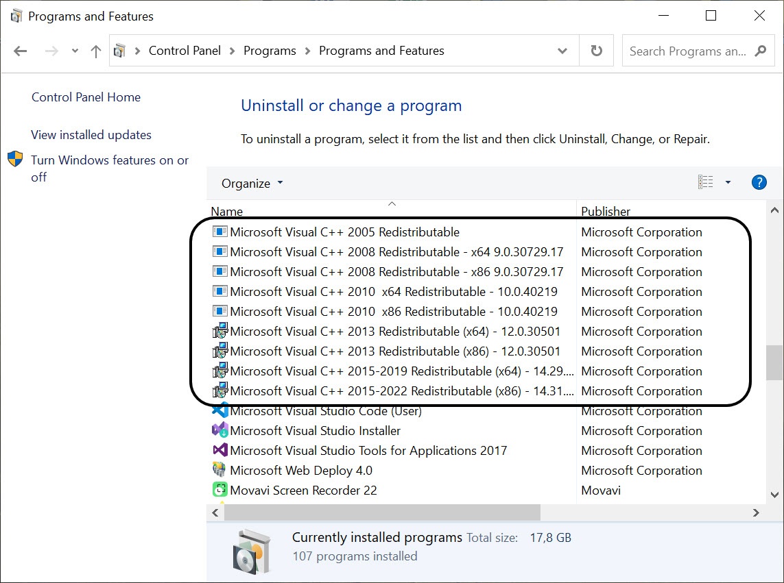 To check the availability of the Visual C++ redistributable packages for Visual Studio, select Start -> Control Panel -> Programs -> Programs and Features.