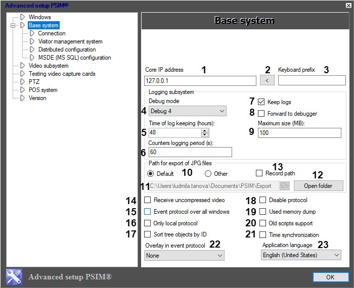 23 | The Application language drop-down list | Select the value from the list | Sets the Axxon PSIM interface language | Names of installed languages | English (United States) | Depends on the set of installed languages. See Axxon PSIM Software System's interface language |