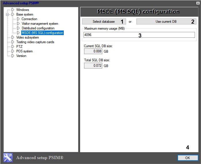 5. In the Maximum memory usage (MB) (3), enter the amount of RAM allocated for the SQL server operation.