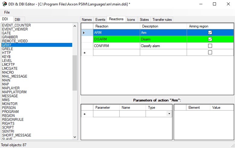 This tab contains the list of all possible object reactions. Each reaction has the following properties: