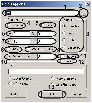 2. If the size of the object will be given in characters [symbols], then check the Width in symbols box (9).