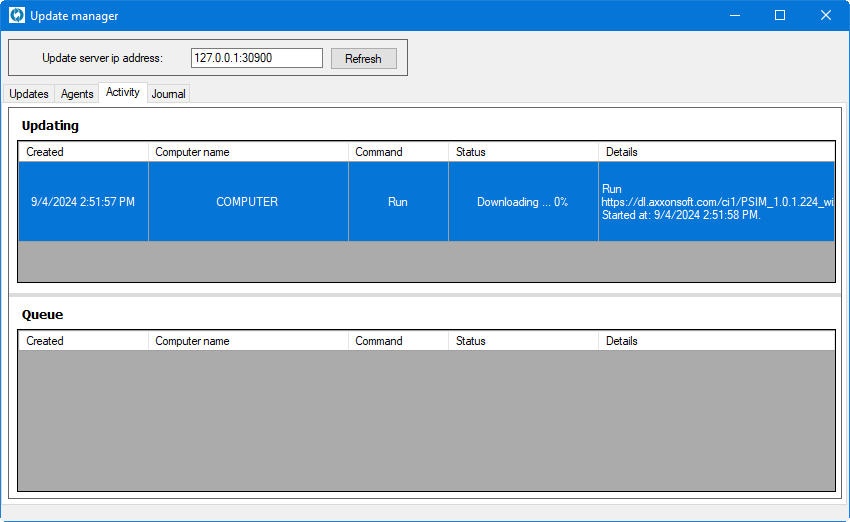 The Activity tab displays the computers with the clients on which the update is in progress or completed (the Updating table), as well as the computers on which the update is scheduled (the Queue table):
