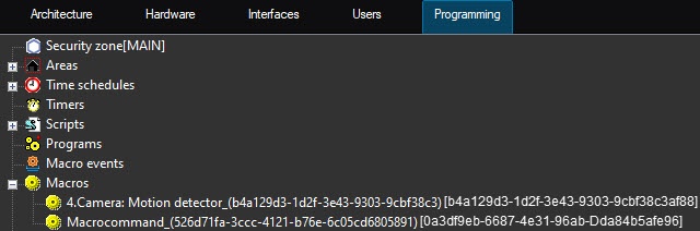 The result of the synchronization is displayed in the information fields Last successful synchronization and Last synchronization state. If the synchronization is successful, the hardware received from Axxon One appears in the hardware list, and the received macros appear in the Macros list on the Programming tab: