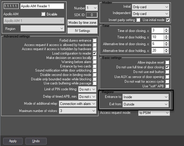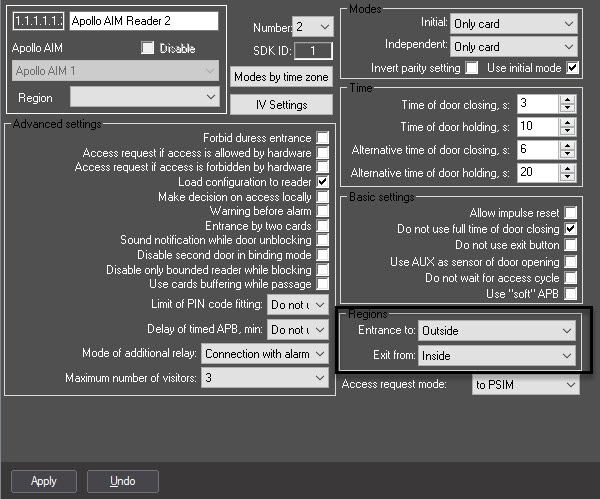 Let's create two regions in ACFA PSIM: Inside and Outside. These regions are set as entrance or exit areas for readers 1 and 2: