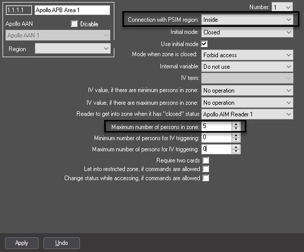 The APB Area 1 is associated with the Inside region and has limited user count of 5. The APB Area 2 is associated with the Outside region and has no limitations on user count.