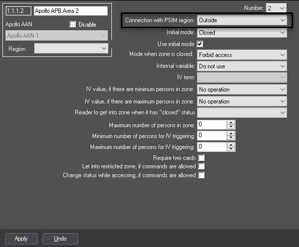 In the system, you must configure at least two APB areas corresponding to entrance and exit regions of a reader. The first APB area is intended to control people count, and it has a limit on the number of users in the area. The second APB area can have no limitations on the number of user, but when entering this area, the number of users in the first area will reduce according to the settings of readers.