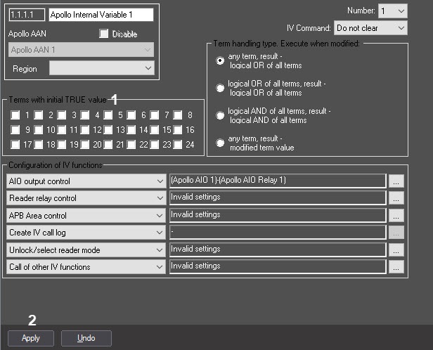 The values of all the 24 terms in the internal variable must be initialized no matter how many terms will be used in this internal variable. By default, when you create an Apollo Internal Variable object, the value of all terms is set to FALSE. Initial values can subsequently be changed in accordance with the rules set for the corresponding Apollo hardware.