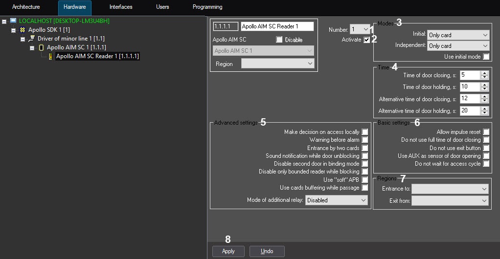 The AIM SC reader is configured on the settings panel of the Apollo AIM SC Reader object. This object is created on the basis of the Apollo AIM SC object.