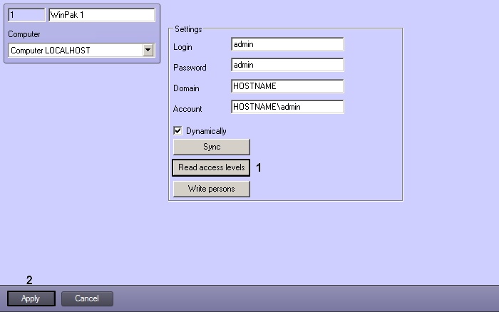 2. Click Read access levels to download a list of access levels from HoneyWell WinPak software (1).