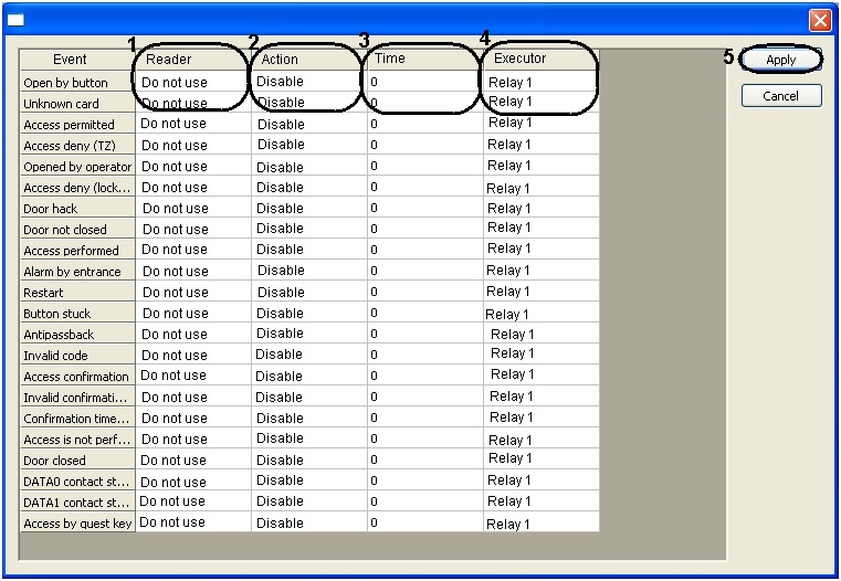 - Set the action performing time in the range from 1 to 255 seconds in the Time column (3).