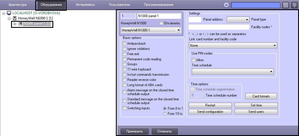 Setting up controllers of HoneyWell N-1000 ACS is carried out on the setting panel of N1000 panel object. This object is created on the basis of HoneyWell N1000 object in Hardware tab of System setting dialog box.