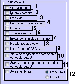 ABA is the MSR ABA TK2 emulation interface for magnetic access cards.- If it’s necessary to create alarm message on exiting the closed time zone set the corresponding checkbox (10).
