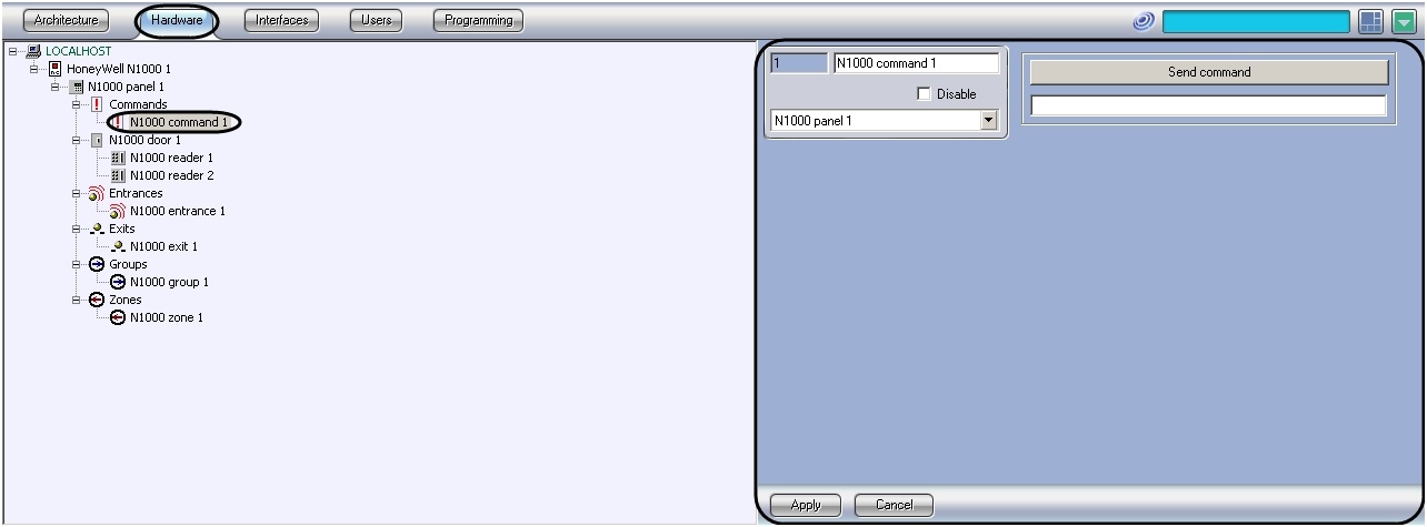 Sending commands to controller is carried out from setting panel of N1000 command object. This object is created on the basis of N1000 panel object on Hardware tab of System settings dialog box.