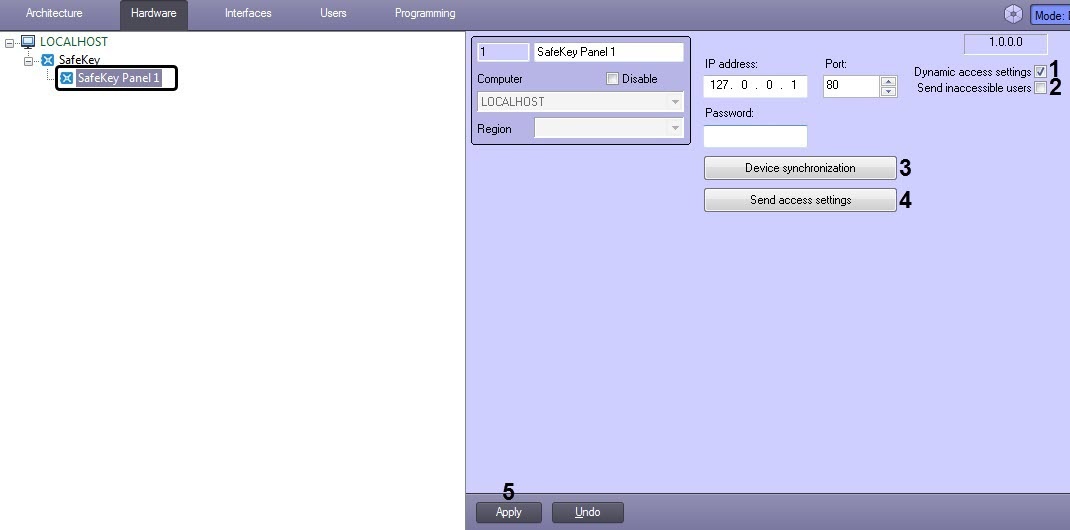 - Click the Device synchronization button (3) to read the SafeKey panel configuration and build the corresponding SafeKey object tree.
