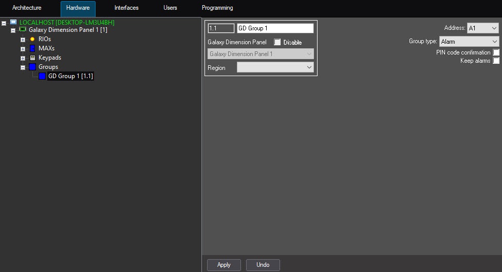 - From the Group type drop-down list, select the type of the group: Alarm, Alarm PL, Simple.