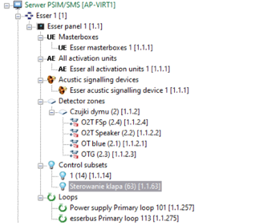 Esser primary loop, Esser detector zone, Esser control subnet, Esser acoustic signalling device, Esser all activation units, Esser Masterboxes are created under the Esser Panel object.