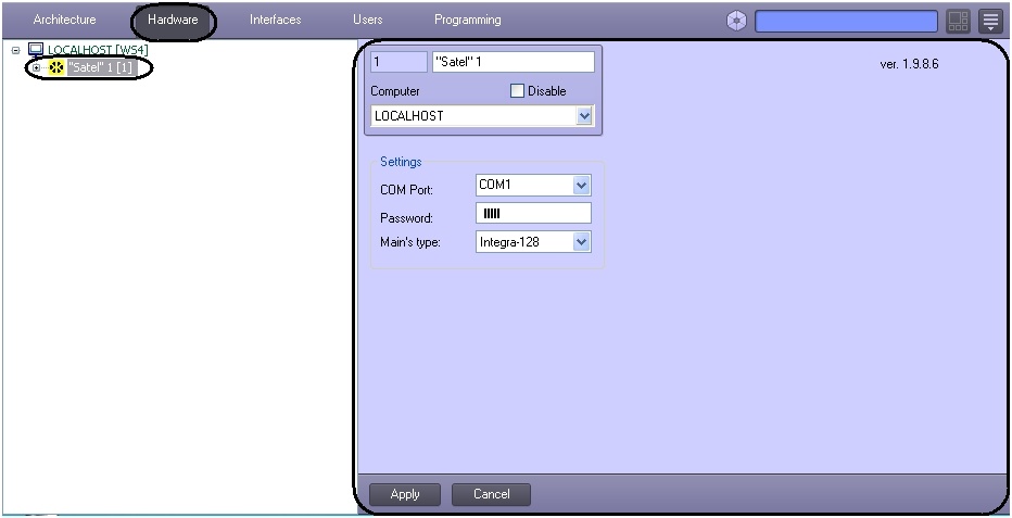 Configuring the Satel SFA connection is performed on the settings panel of the Satel SFA object. The objects must be created based on the Computer object on the Hardware tab of the System Settings dialog.