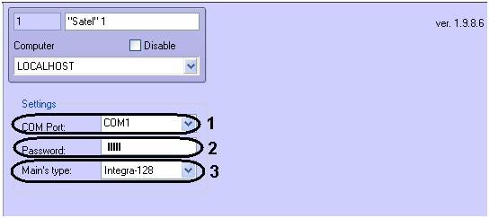 - From the COM Port: drop-down list select the COM port to which the Satel control panel (1).