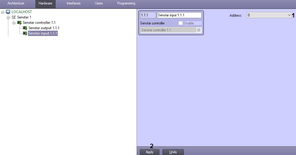 - In the Address field (1), enter the Senstar controller input address.
