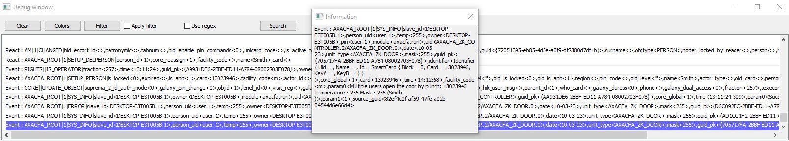 After that, generate a required event, e.g. put the access card to the reader, trigger an alarm, etc. When the event is displayed in the Debug window, right-click on it. The available event parameters will be displayed in the appeared window.