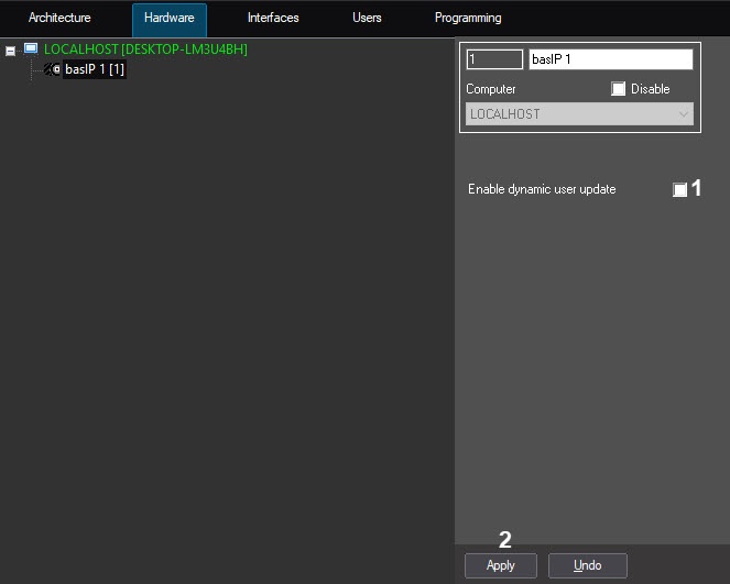 - Go to the settings panel of the basIP object that is created on the basis of the Computer object on the Hardware tab of the System settings dialog window.