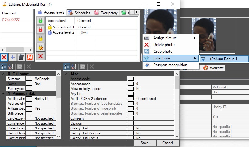 - In the editing window of the user to whom you want to add fingerprints, right-click the photo and select Extensions → Dahua.