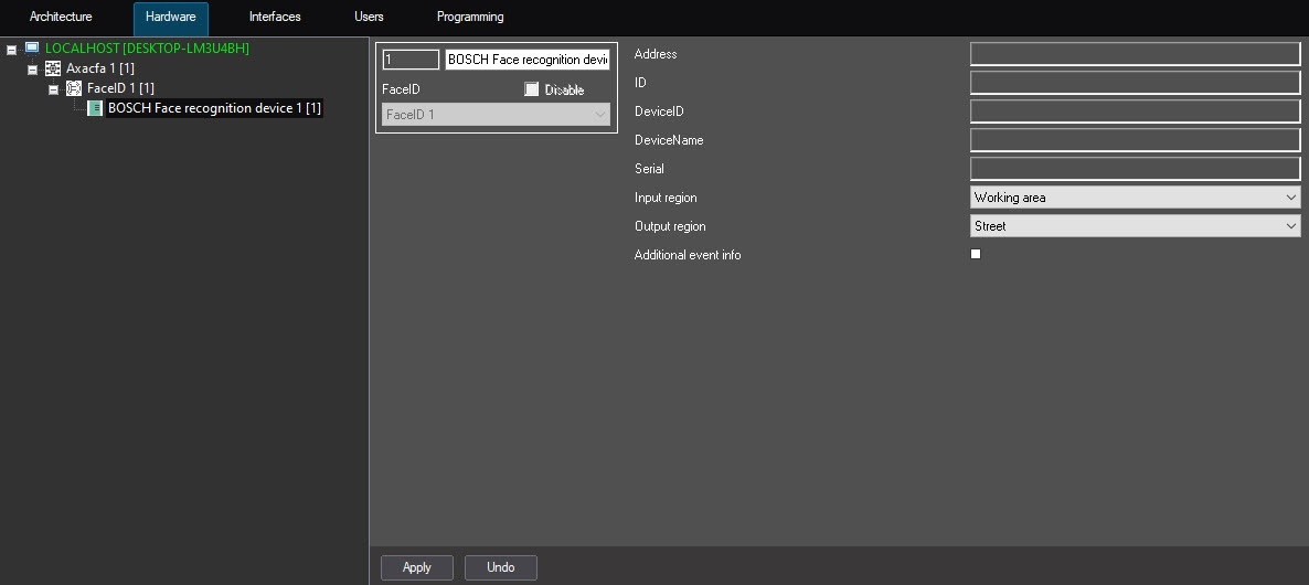 - Go to the settings panel of the BOSCH Face recognition device object that is created after you download the configuration on the basis of the FaceID object.