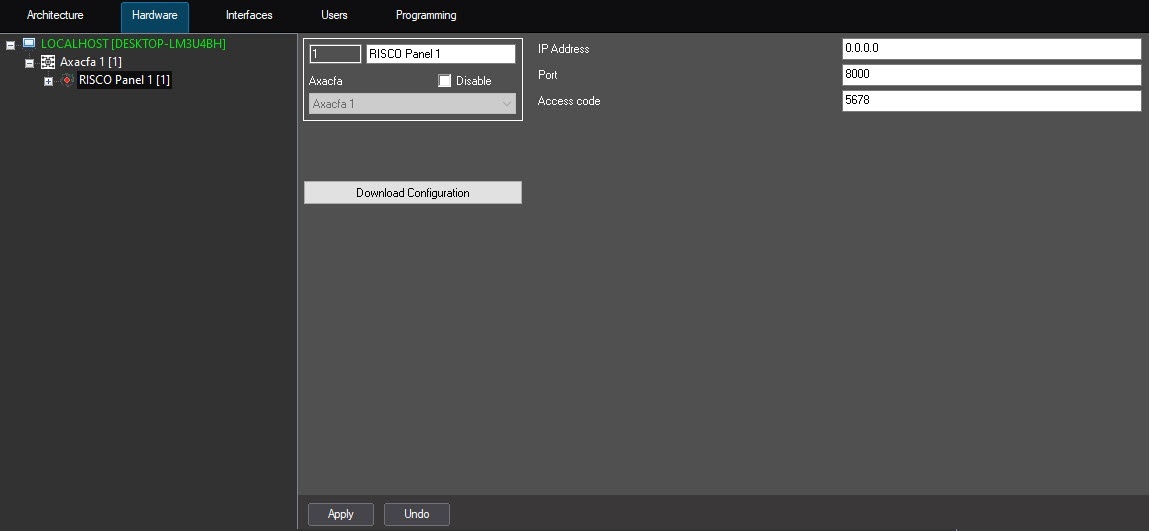 - Create the RISCO Panel parent object on the basis of the Axacfa object on the Hardware tab of the System Settings window.