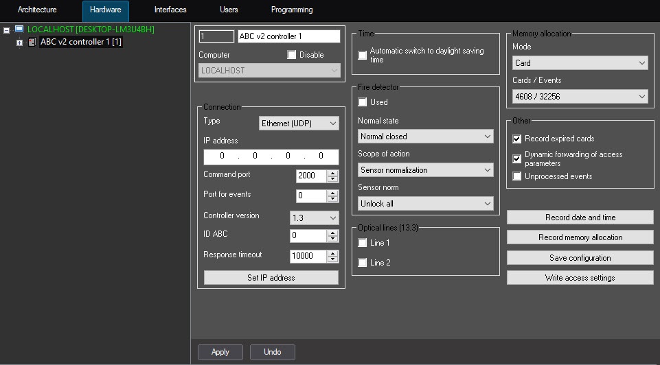 You can configure the ABC v.2 central controller on the settings panel of the ABC v2 controller object that is created on the basis of the Computer object on the Hardware tab of the System settings window.
