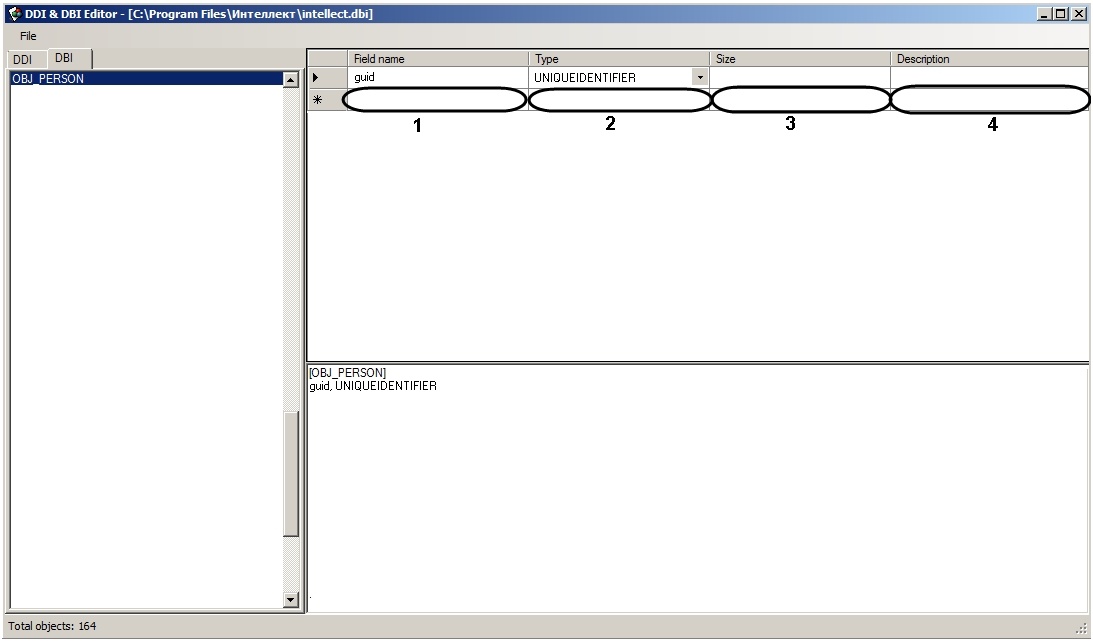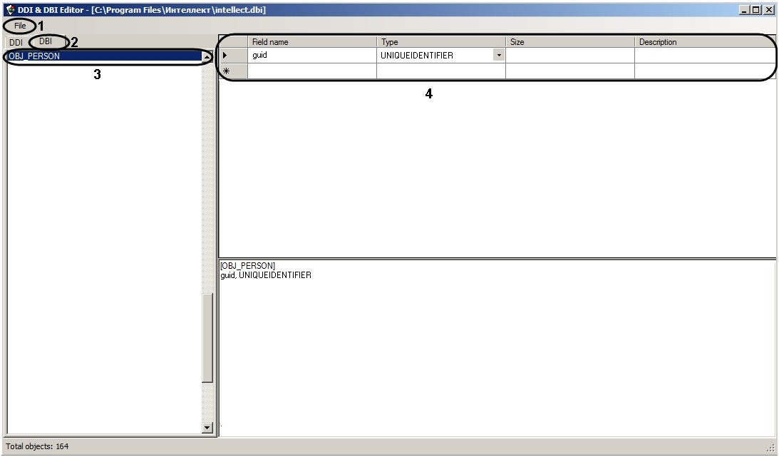 This file is currently not included in ACFA Intellect. Contact AxxonSoft customer support to receive intellect.exe.dbi. The file should be placed in ACFA Intellect installation directory.- Go to the DBI tab (2) and select the OBJ_PERSON table (3).