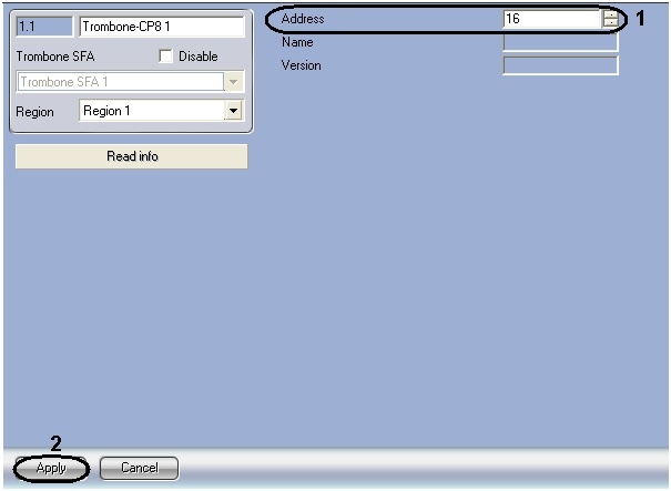 Setting up connection of Trombone-CP8 to Intellect Server is carried out on the setting panel of Trombone-CP8 object. This object is created on the basis of Trombone SFA object in Hardware tab of System setting dialog box.
