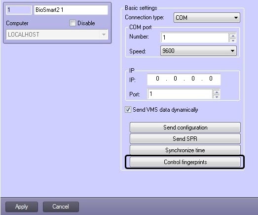 - On the settings panel of the BioSmart2 object, click the Control fingerprints button.