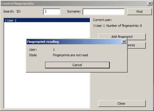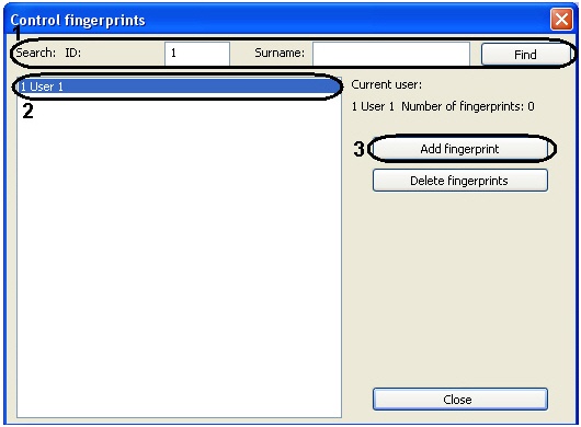 - The number of fingerprints added for the selected user will be displayed in the Control fingerprints box.