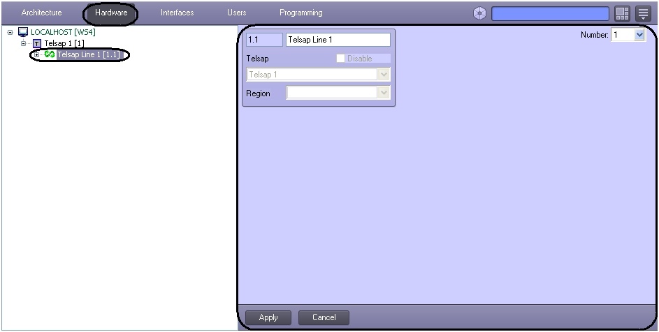 The Telsap Line object is configured on the Telsap Line object’s settings panel. This object is created on the basis of the Telsap object on the Hardware tab of the System Settings dialog window.