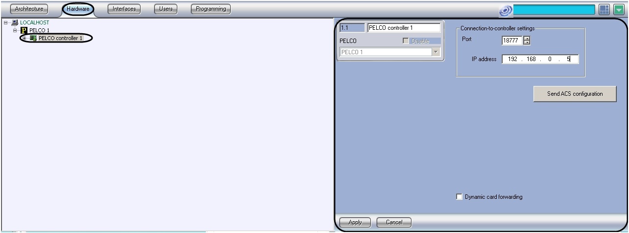 In the ACFA Intellect system, configure the Pelco controller connection on the Pelco controller settings panel which is on the Hardware tab of the System settings dialog box.