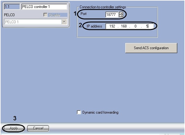 2. In the Port field, use the up and down buttons to set the connection port for the Pelco controller (1).