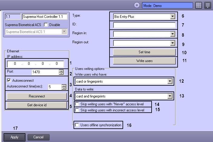 - Set the Offline synchronization checkbox to maintain the current information about users in controller in spite of breaking the connection (16).