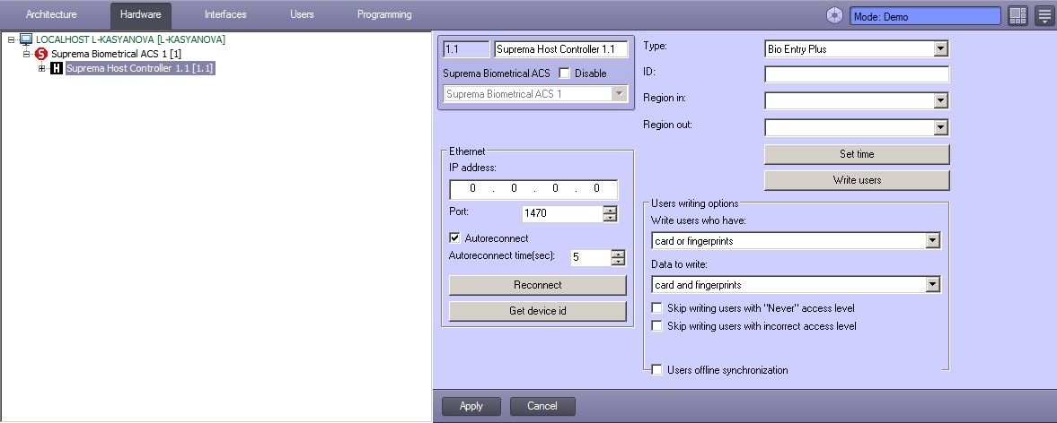 The Suprema Host Controller object is configured on the Suprema Host Controller object's settings panel. This object is created based on a Suprema Biometrical ACS object on the Hardware tab of the System Settings dialog.
