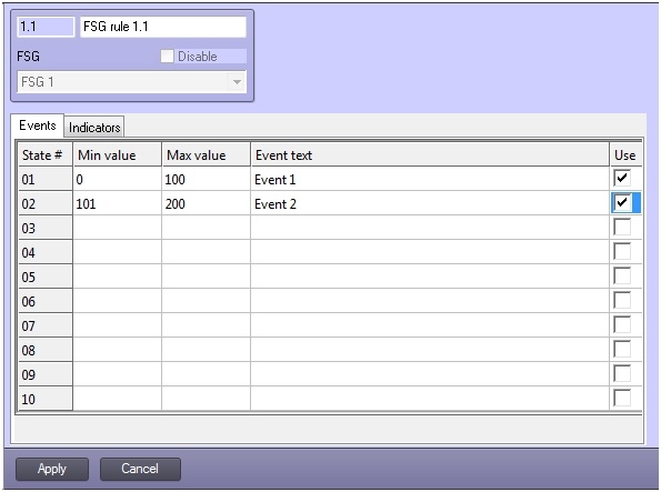 To configure this rule it is required to set the following parameters in the Events tab on the settings panel of the FSG rule object.