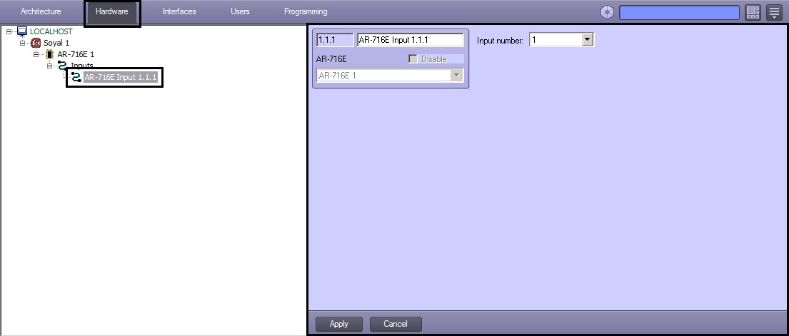 Configuration of AR-716E Input object is carried out on setting panel of corresponding object. This object is created on the basis of AR-716E object on Hardware tab of System settings dialog box.