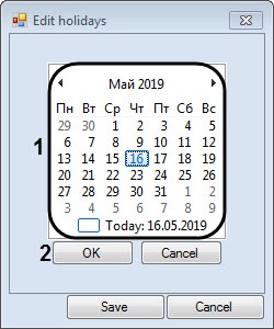 5. Select holiday date in the calendar (1) and click the OK button (2). The holiday will be added to the list.