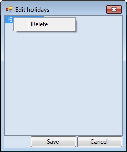 To delete holiday click the right mouse button on it and select the Delete item in the opened functional menu.