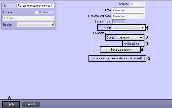 In ACFA Intellect the Forteza one-position sensor is configured on the settings panel of the Forteza one-position sensor object. This object is created under the Forteza object in the Hardware tab of the System settings dialog box.